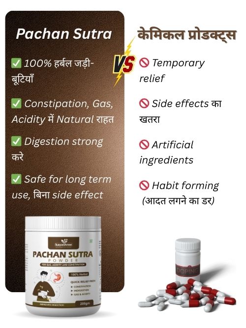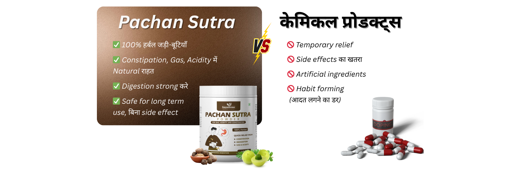 अब पाचन से जुड़ी समस्याओं से प्राकृतिक राहत प्राप्त करें पाचन सूत्र के साथ। यह विशेष रूप से तैयार किया गया आयुर्वेदिक मिश्रण नागरमोथा, पुष्करमूल, गुलाब पत्तर, त्रिफला, सौंफ, फिटकरी और निशोत जैसी पारंपरिक जड़ी-बूटियों से बना है, जो पाचन तंत्र को स्वस्थ बनाए रखने के साथ गैस, एसिडिटी, कब्ज़ और पेट फूलने जैसी समस्याओं को कम करने में सहायक है।