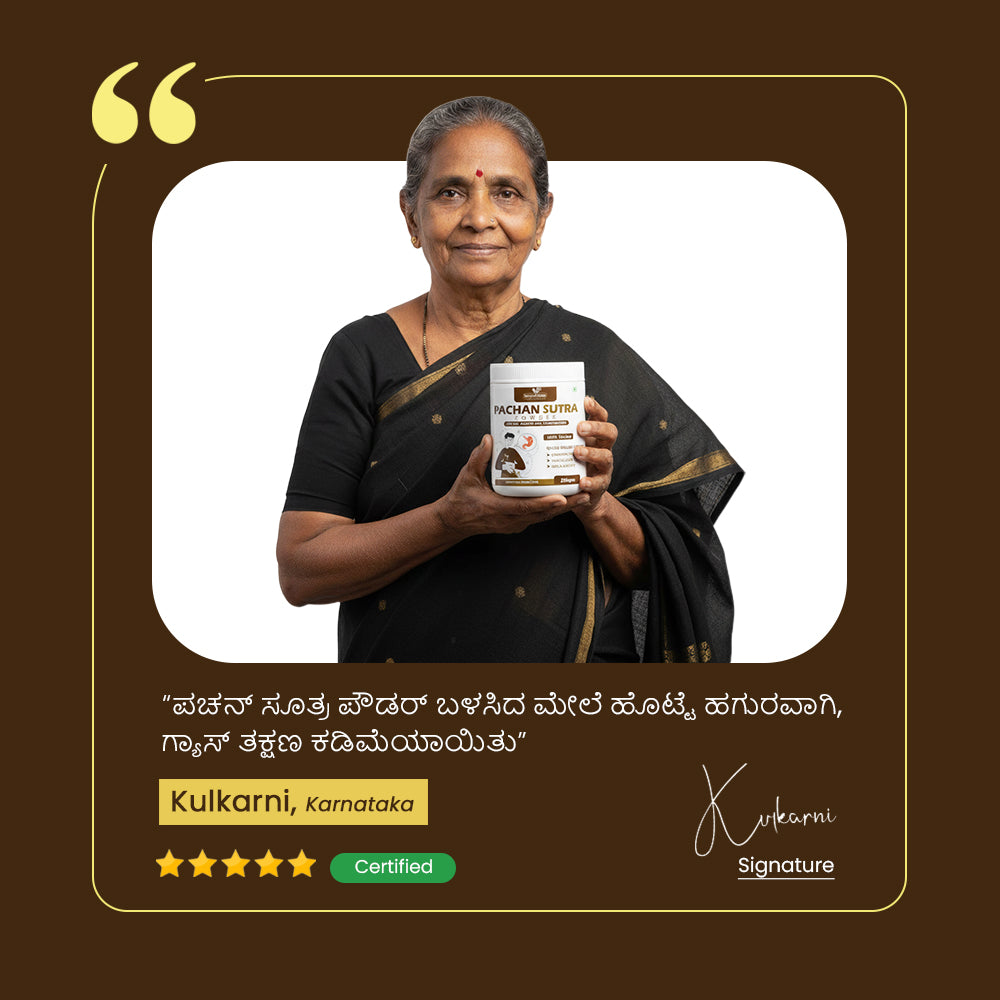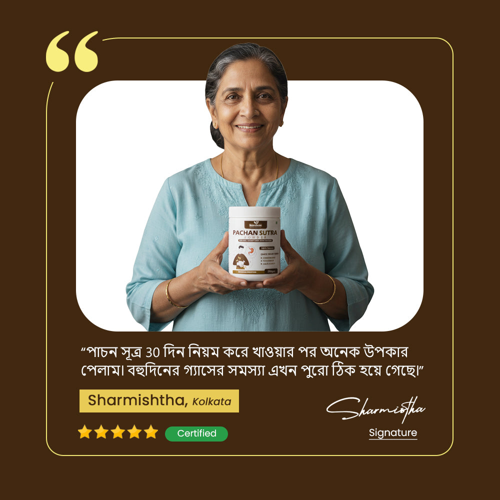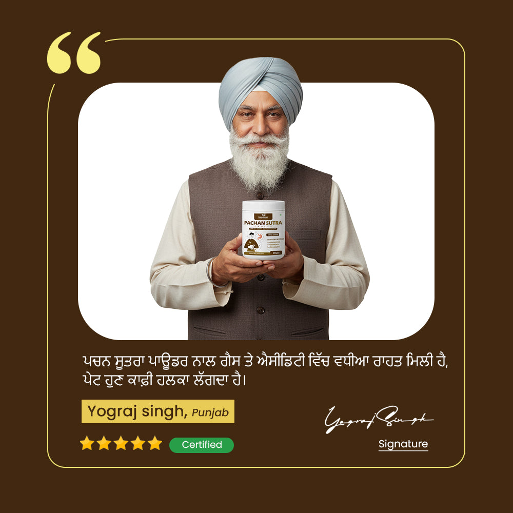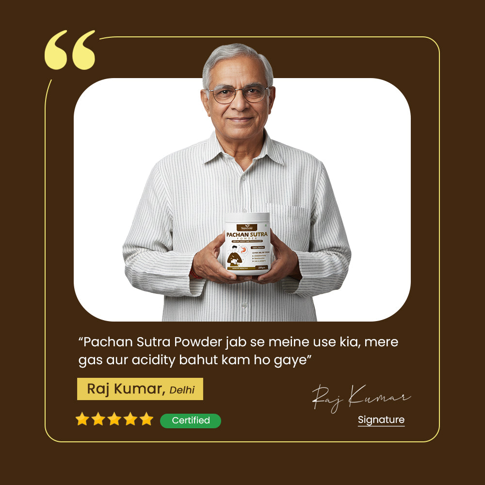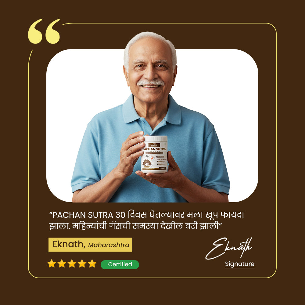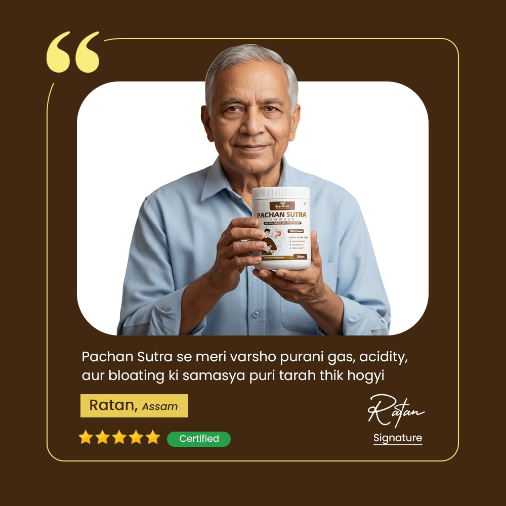 Pachan Sutra Powder 100% शुद्ध और आयुर्वेदिक मिश्रण है, जिसे नागरमोथा, पुष्करमूल, गुलाब पत्ते, त्रिफला, सौंफ, फिटकरी और निशोत जैसी पारंपरिक जड़ी-बूटियों से तैयार किया गया है। यह गैस, एसिडिटी, पेट फूलना और कब्ज जैसी पाचन समस्याओं से प्राकृतिक राहत प्रदान करता है। इसके नियमित सेवन से पाचन तंत्र संतुलित रहता है, भोजन का पाचन बेहतर होता है और पोषक तत्वों का सही अवशोषण होता है। यह पेट को हल्का, शांत और आरामदायक बनाए रखता है, जिससे शरीर ऊर्जावान महसूस करता है और संपूर्ण पाचन स्वास्थ्य सुदृढ़ होता है।